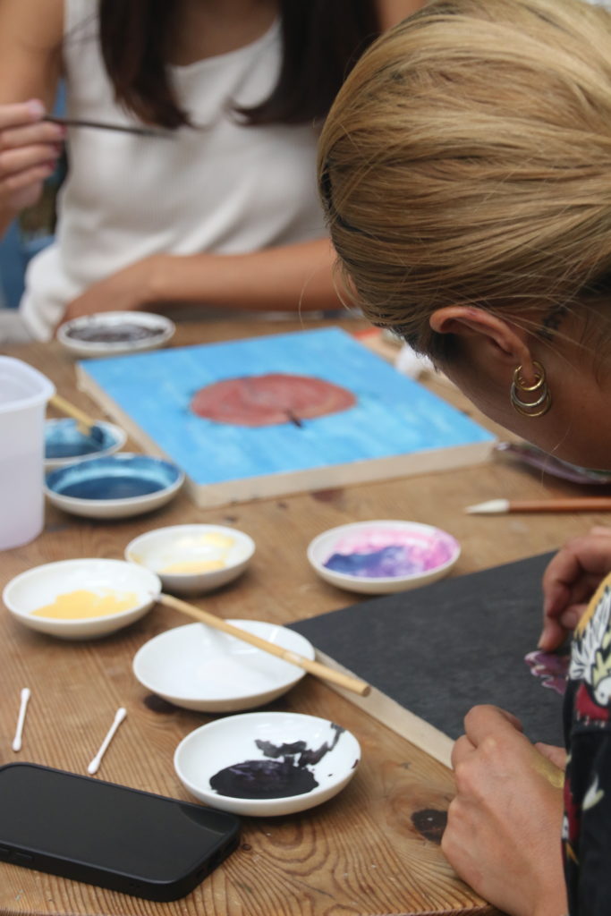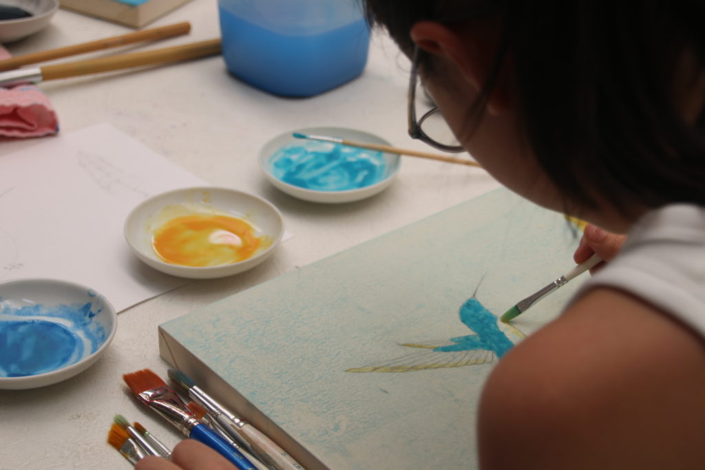 日本画が初めての人、昨年のリピーターさんなど、たくさんの参加者のお申込みをいただいた今回。早々に定員オーバーになるほどの人気でした。